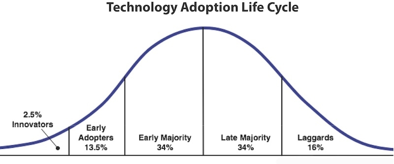 Il Bitcoin sta lentamente soppiantando i mezzi di scambio metallici e a fiat. Attualmente sta passando dalla fase degli "innovatori" a quella degli "early adopters":